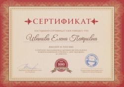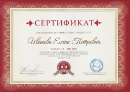 входит в топ -100 в рейтинге выдающихся женщин федерального информационного проекта "Мир Женщин" за 2018 год, что подтверждает Сертификат и Энциклопедия "Мир женщин", участником которой Е.П.Иванова является.