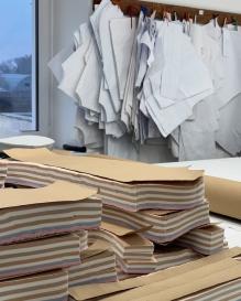 Классический интерьер швейного производства: стена лекал и готовый крой на партию изделий...